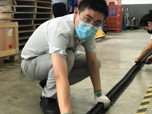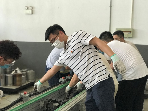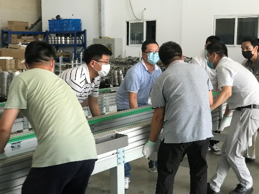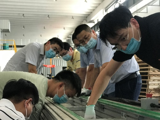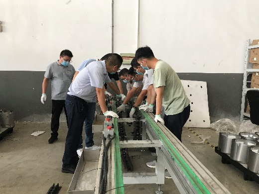 酷暑高温下,全体同志配合默契,连续奋战7个小时,顺利完成装配线滚子道的主体安装任务,达到了预期目标。