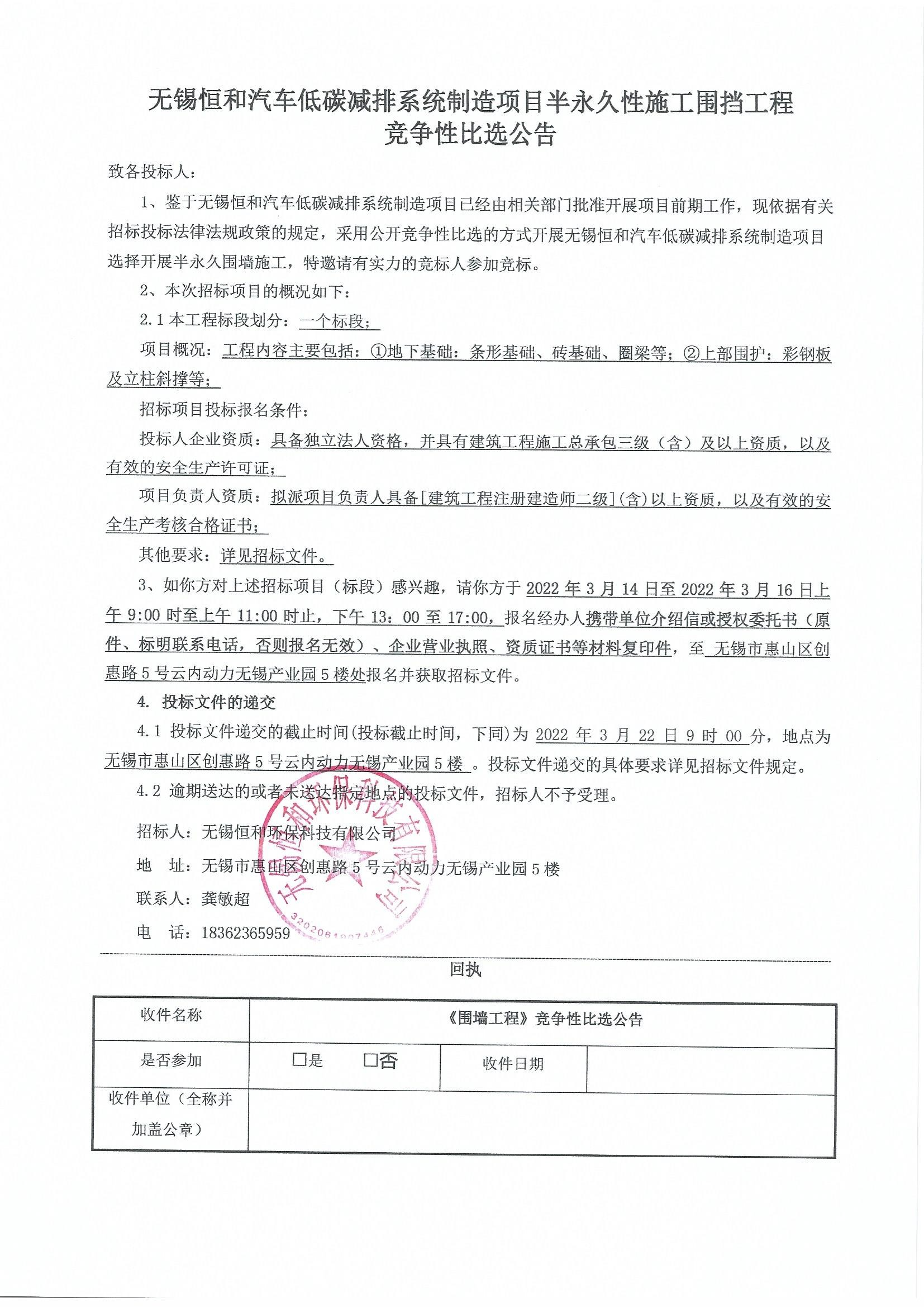 无锡恒和汽车低碳减排系统制造项目半永久性施工围挡工程竞争性比选公告