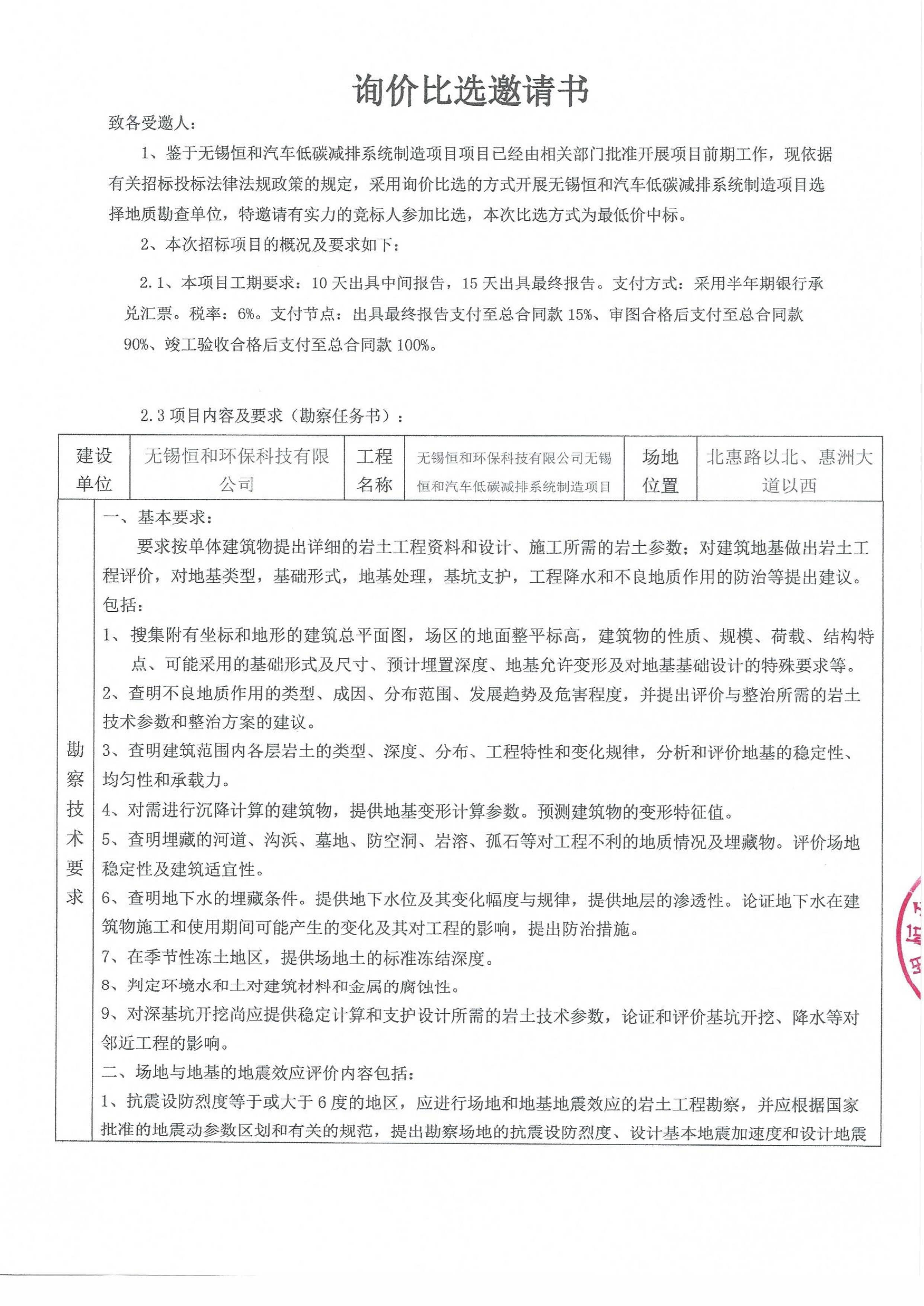 无锡恒和汽车低碳减排系统制造项目选择地质勘查单位的询价比选公告