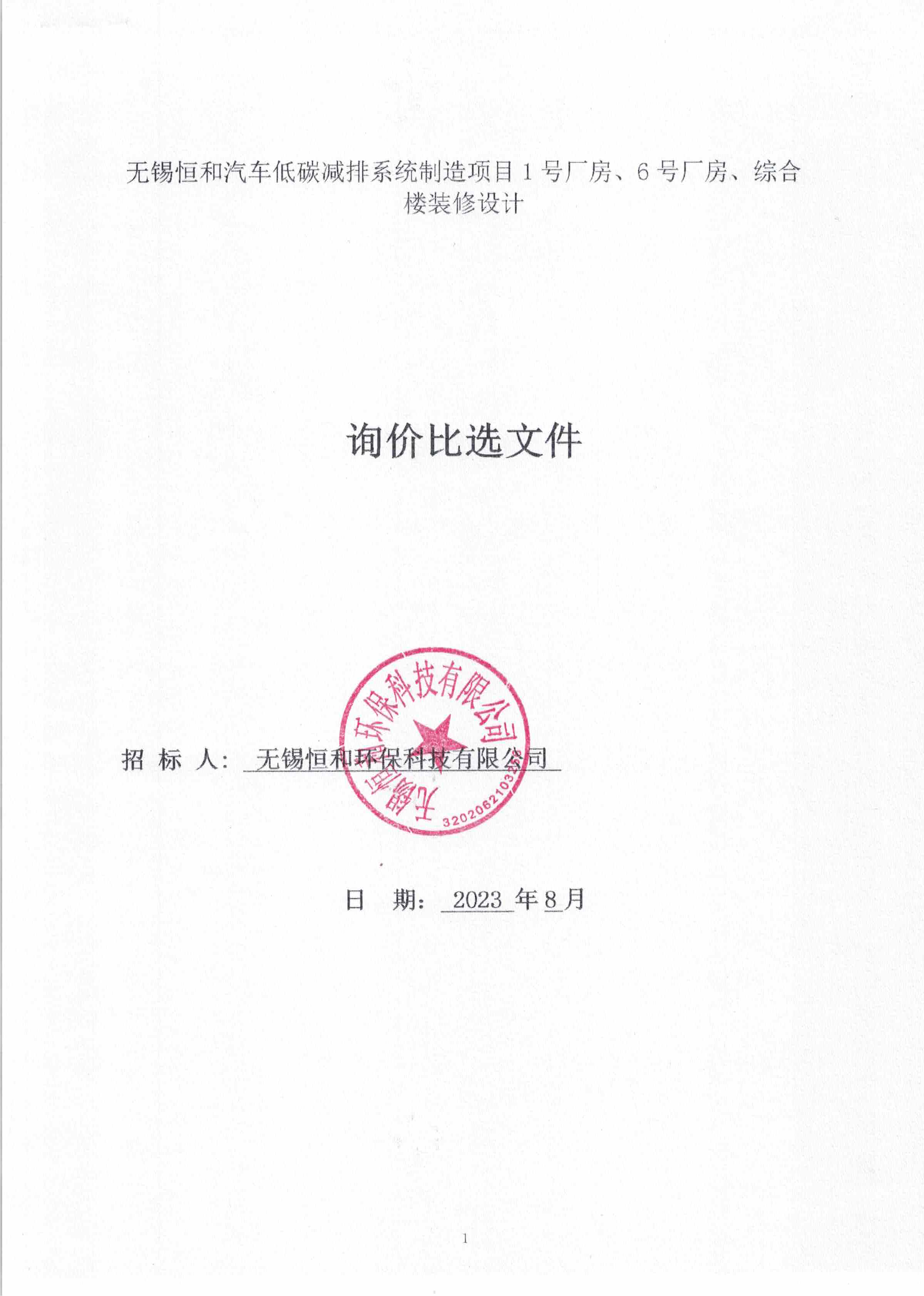 无锡恒和汽车低碳减排系统制造项目1号厂房、6号厂房、综合楼装修设计询价比选公告