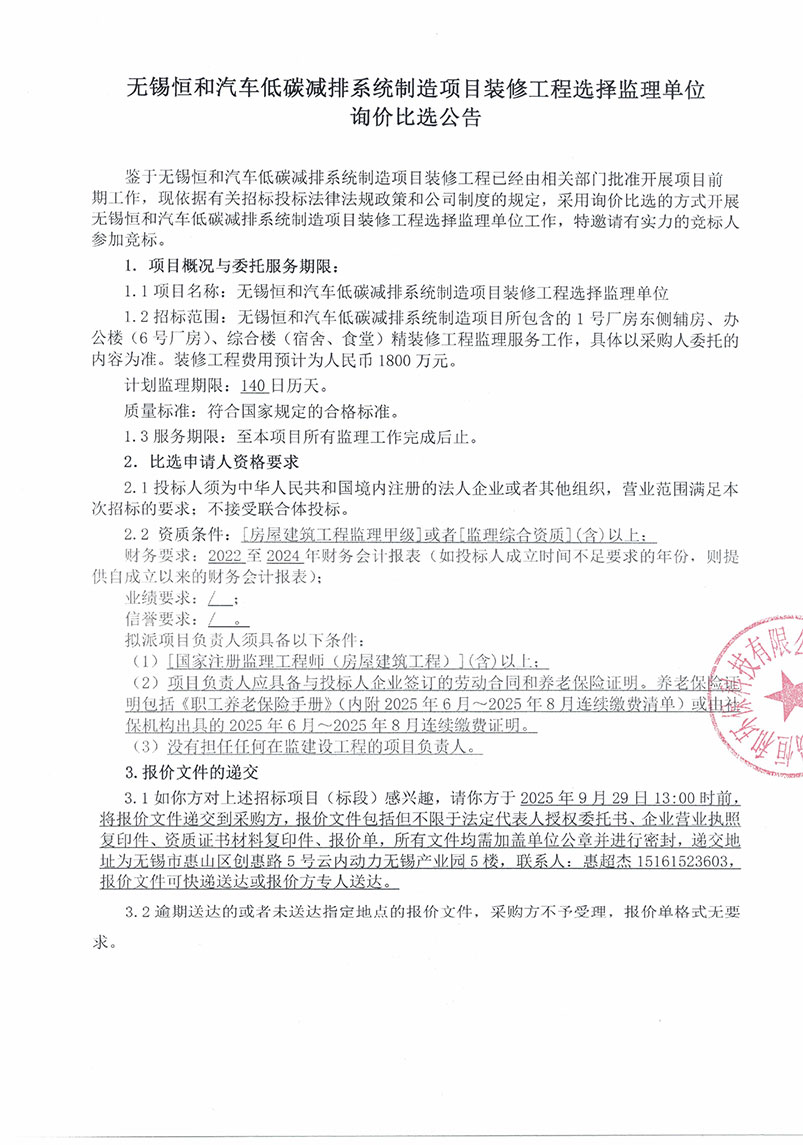 [附件下载:无锡恒和汽车低碳减排系统制造项目装修工程选择监理单位询价比选公告]