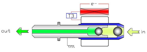 电磁线圈驱动的套筒/柱塞泵,以脉冲方式驱动套筒或者柱塞相对运动,压缩容液体喷射计量积内的液体并输送到压力喷射喷嘴。 设计单次工作输送容积固定,控制系统输出不同的脉冲宽度在输送容积以内来调节单次输送液体容积(调幅控制)。控制系统也控制两个工作脉冲之间的间隔时间,调整间隔时间也可以调整平均输出泵液流量(调频控制)。通过调频调幅控制,可以获得很大动态范围的平均流量调节。通过与发动机相位同步控制,可以实现准确同步相位喷射。